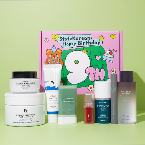 The StyleKorean “Happy 9th Box” is an impeccably curated celebration of beauty, marking the retailer’s ninth anniversary with a bang. This box is brimming with full-sized, high-value products that cater to a variety of skincare and cosmetic needs, making it a tempting offer for any beauty enthusiast.